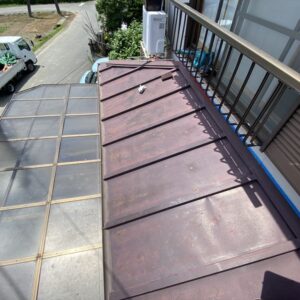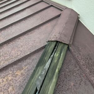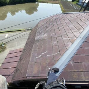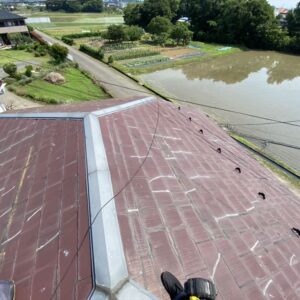 下屋根の棟板金が飛散してしまっていました。大屋根は機会がなく長期に渡りメンテナンスのタイミングを逃してしまっていた為屋根材表面の塗膜が剥がれてしまっていました。