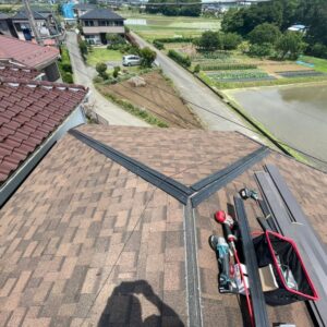 次いで、屋根材本体を葺いていきます。本体を葺いた後は棟を取り付けていきます。