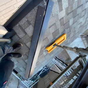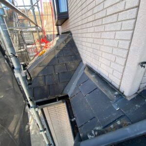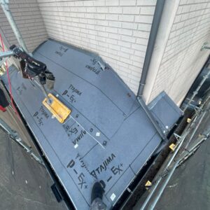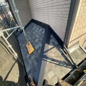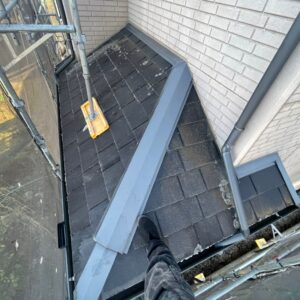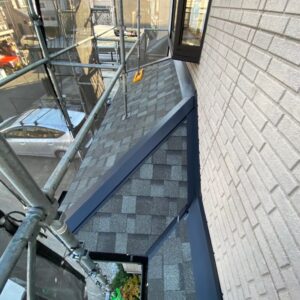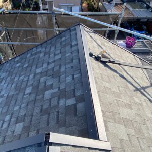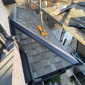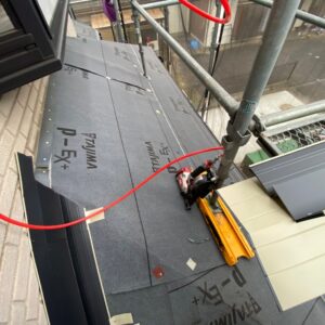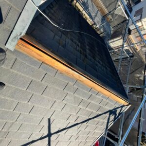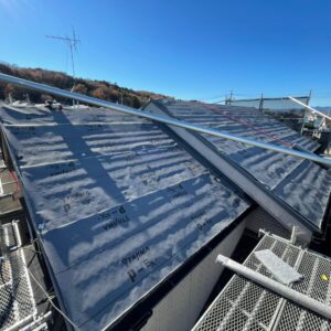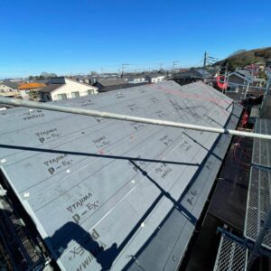 次に、ルーフィング(防水シート)を敷いていき、下地役物を取り付けていきます。