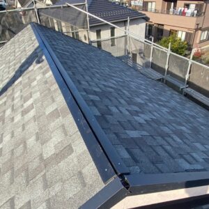 次いで、屋根材本体を葺いていきます。本体を葺いた後は棟を取り付けていきます。