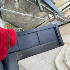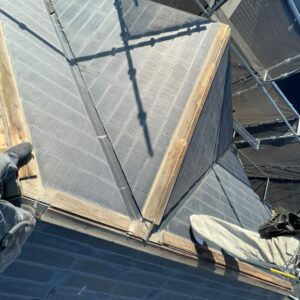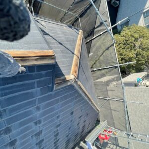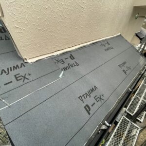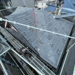 次に、ルーフィング(防水シート)を敷いていき、下地役物を取り付けていきます。