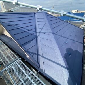 使用した屋根材はスーパーガルテクト Col.シェードブルーです。