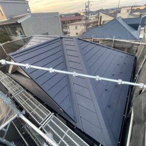 お客様自身でかなりリフォームに対してリサーチをしたそうで、その中で”どうせやるなら1回でしっかりと”という想いが強くあったそうで、私どもにご連絡頂く前は屋根と外壁共に塗装でお考えになっていたそうですが、リサーチしていく中で上葺きがいいのではないか。というお考えに至ったそうで今回上葺きを実施いたしました。