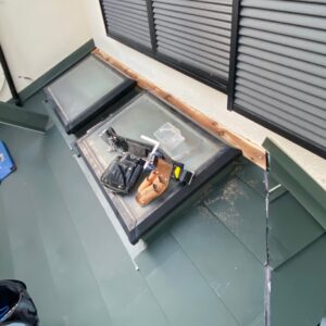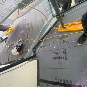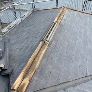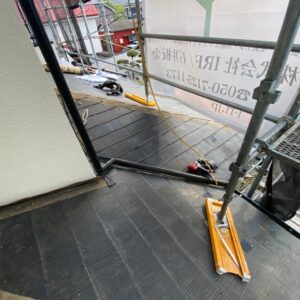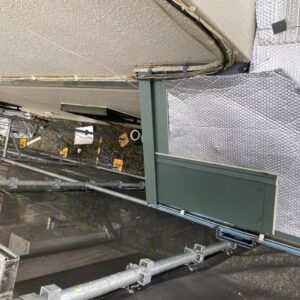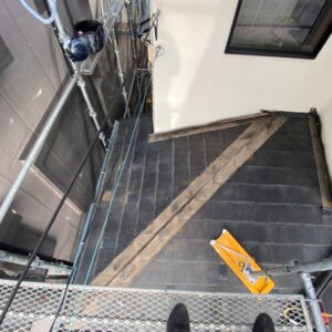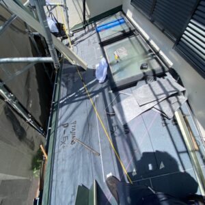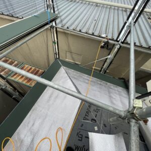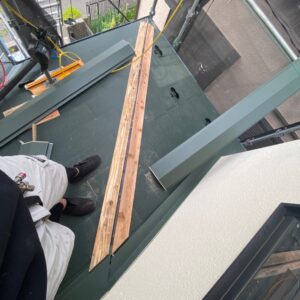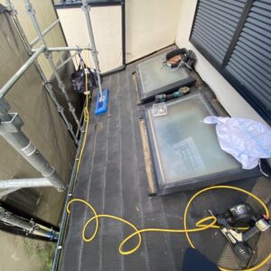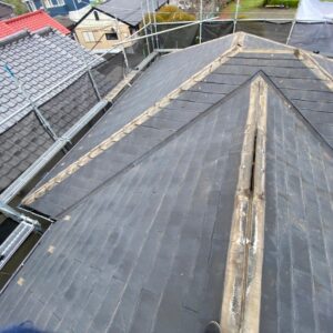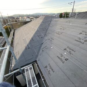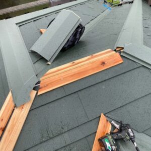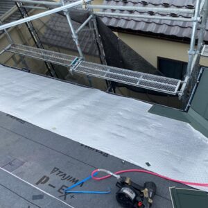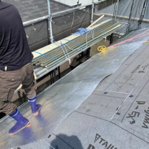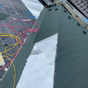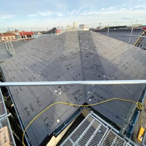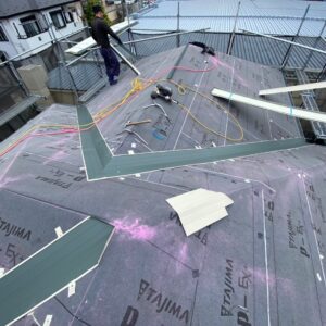次に、ルーフィング(防水シート)を敷いていき、下地役物を取り付けていきます。