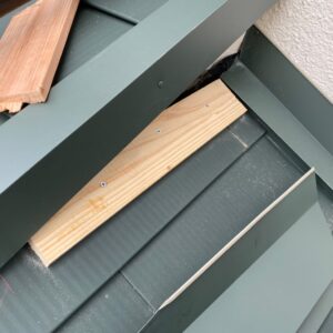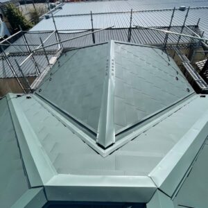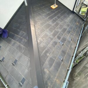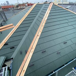 次いで、屋根材本体を葺いていきます。本体を葺いた後は棟を取り付けていきます。