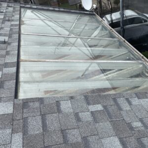 お客様のこだわりにより、昨年おこなった上葺き工事の際に残した天窓がベランダの真上にあり、ベランダの天井からシトシト水が落ちてくるという相談を受けました。