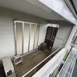 改善すべく、天窓部を撤去して屋根を貼り、ベランダ上部の板を張り替える工事を行うと同時に足場を組む為、外壁の塗装を行いました。