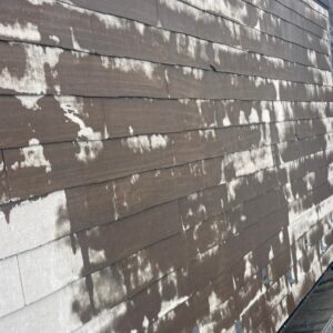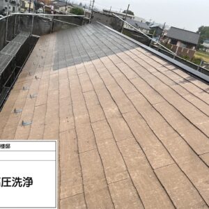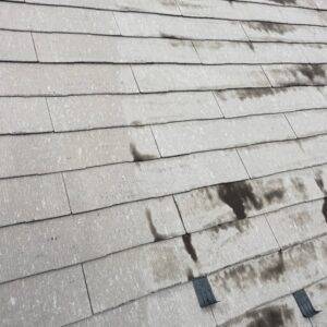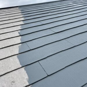 苔と汚れを落とすだけでここまで見違えるようになりましたが、これはスレートの地肌になります。なのでここから塗膜で保護していきます。