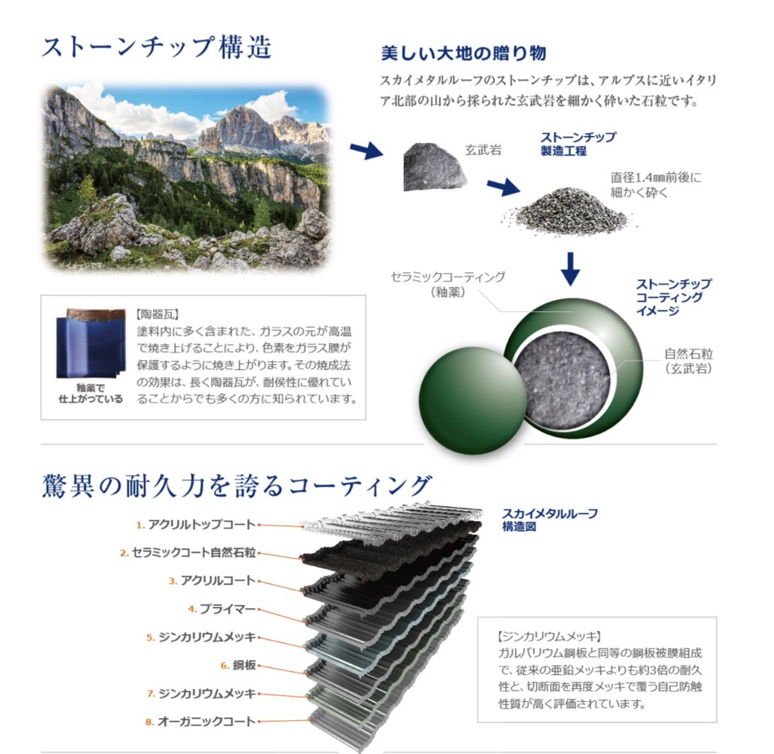 屋根材の表面には、イタリア北部アルプス近郊で採取される高品質の天然玄武石チップが使用されております。