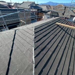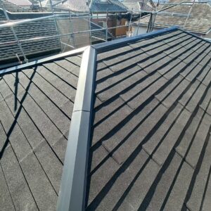 今回使用した、スカイメタルルーフはメンテナンスフリーの屋根であり、ジンカリウム鋼板にストーンチップ加工を施している材料となります。また、メーカーからの美観補償が30年、製品保証で50年と充実した保証内容なので弊社でもおすすめしております。