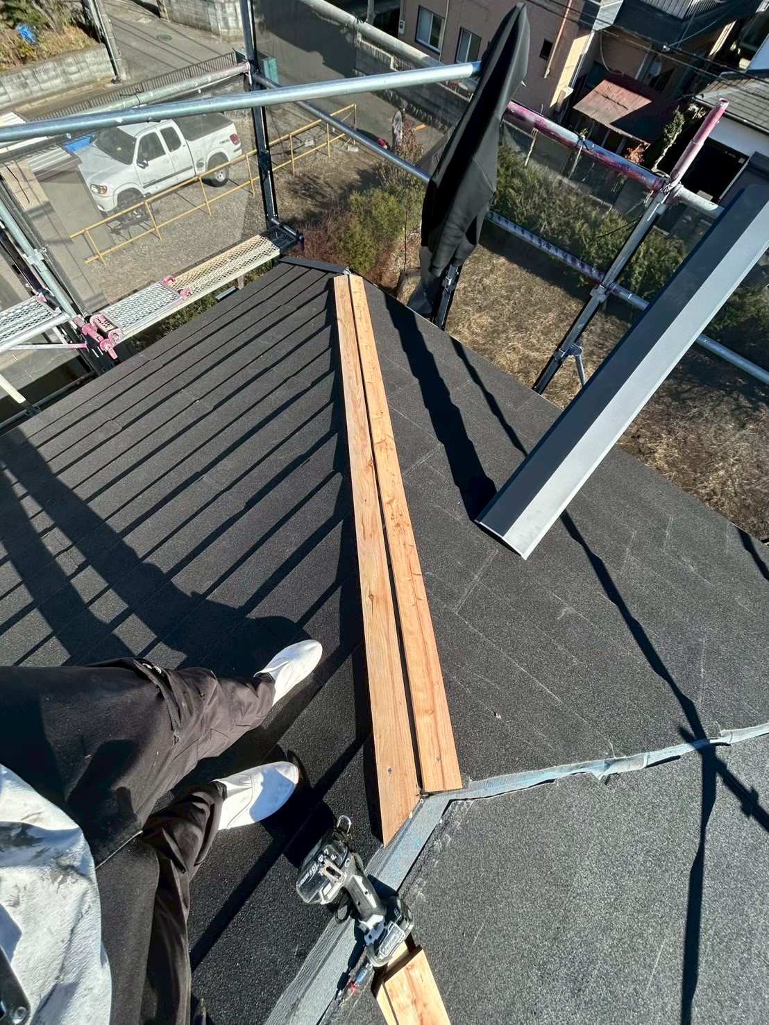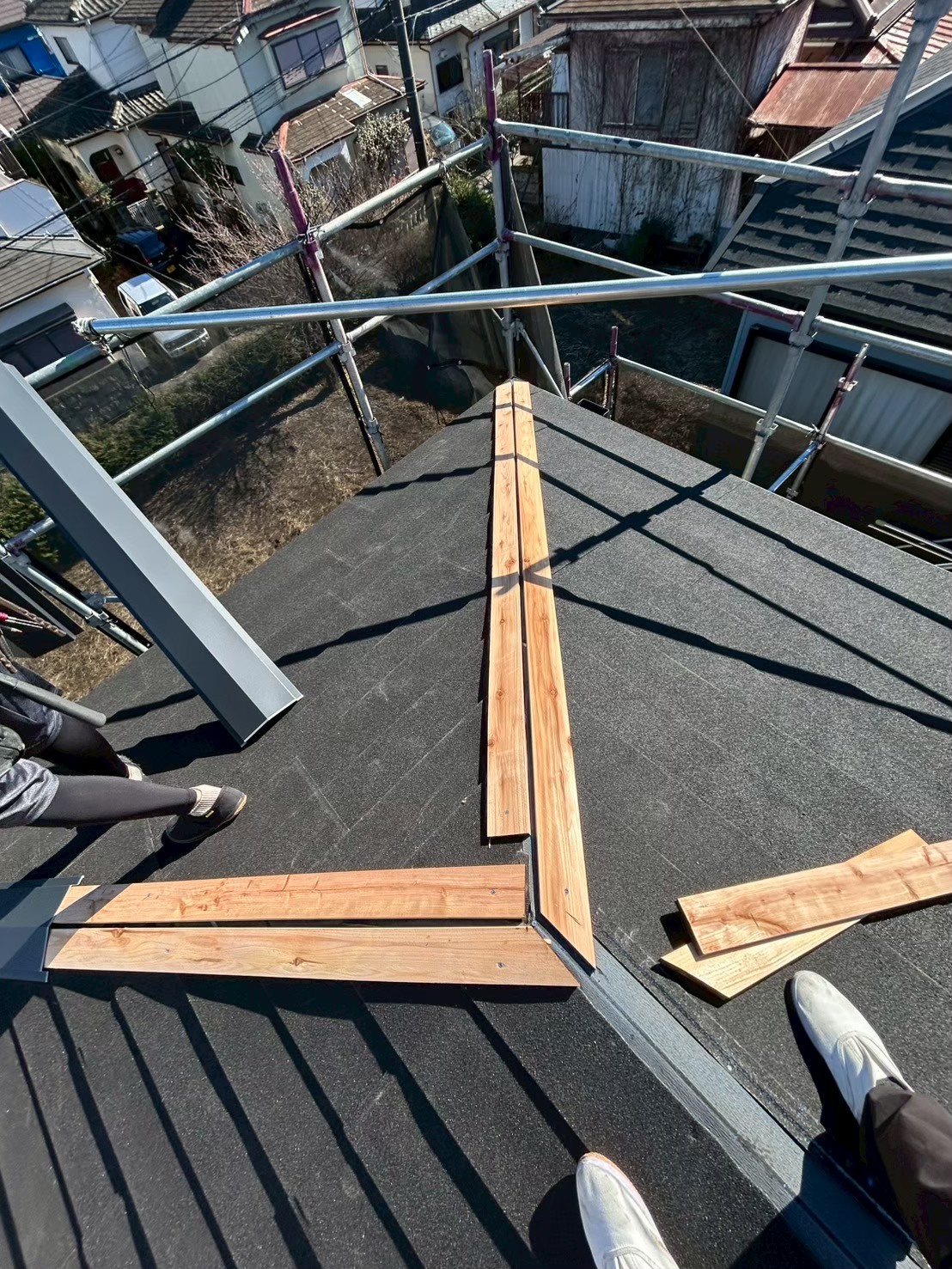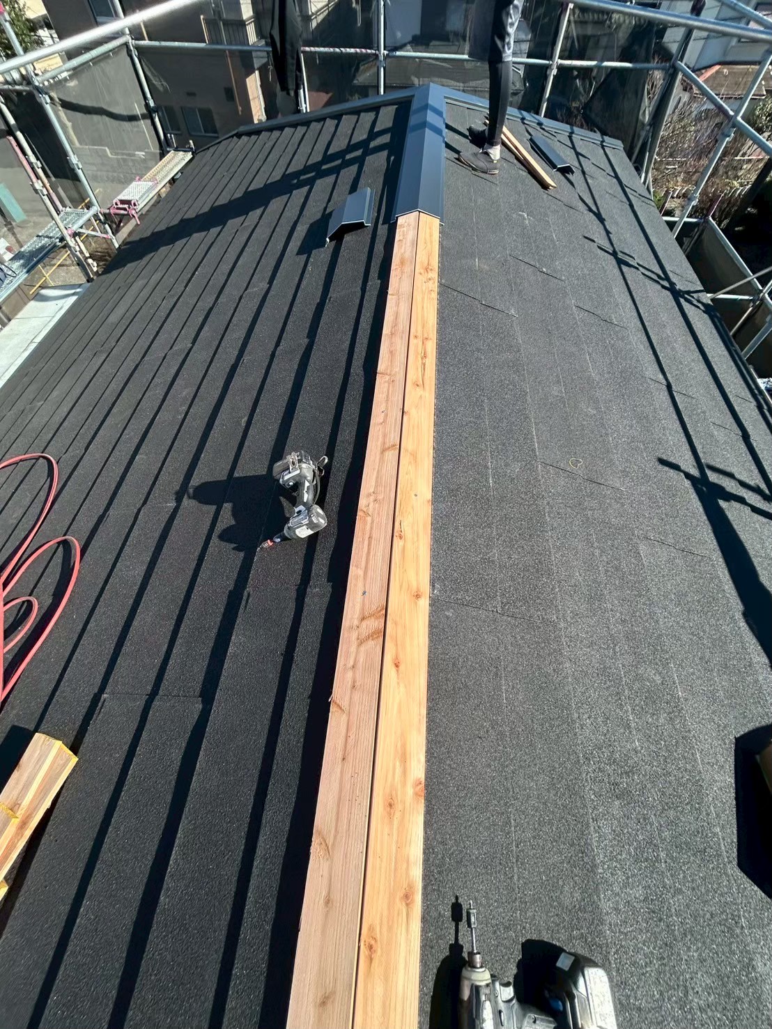 続いて、本体施工とともに棟下地を取り付けていきます。