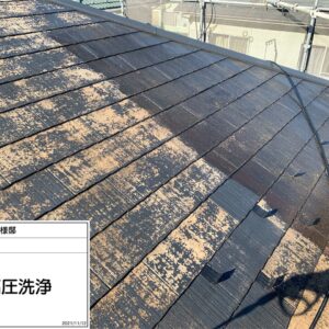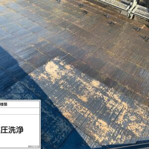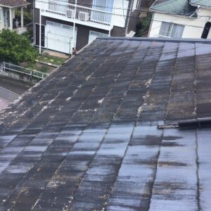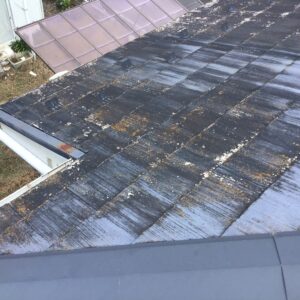 塗膜が劣化して苔が生えてしまっている様子でした。